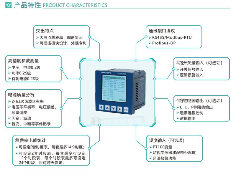 PUMG750是遵循国际电能质量标准而推出的新一代高端电能质量分析仪表,监测所有电能质量参数,如闪变,记录电压短时中断,谐波最高至63次的测量分析。