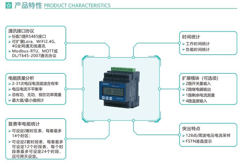 1.测量三相交流电压、电流、四象限电能、有功/无功功率、