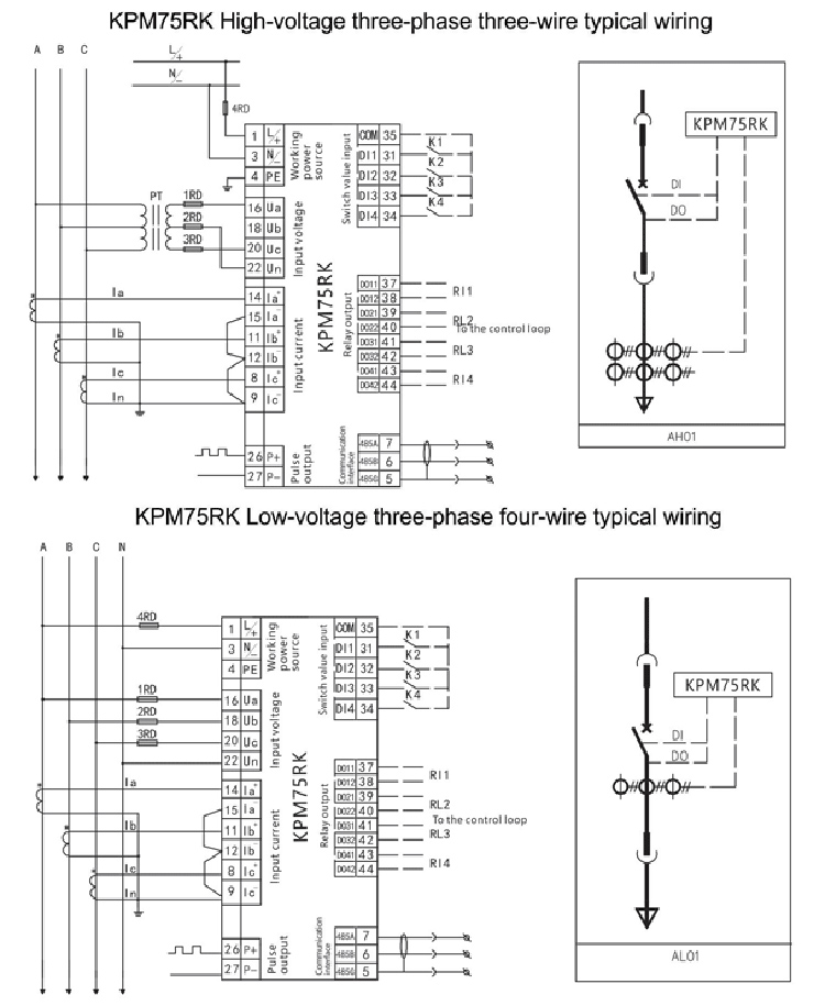 1. The wiring diagram is suitable for high voltage three-phase three-wire system, low voltage three-phase four-wire system, regard to other system wiring. 2. Please refer to KPM75 instruction manual.