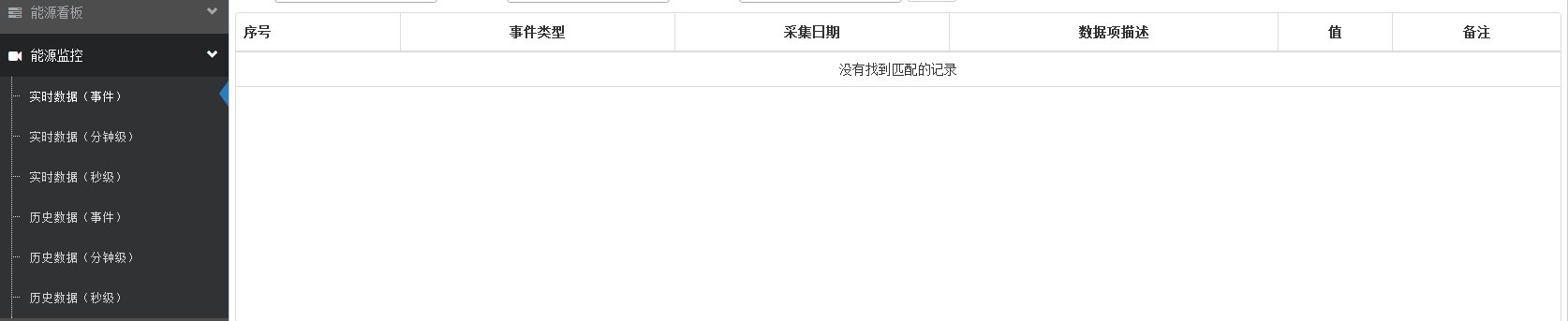 当现场设备有遥信变位、越限告警或故障报警时,会在实时数据(事件)中查到,选择集中器,选择监测点,点击查询就会调出当前用能设备事件记录。选择企业,选择集中器,选择监测点,选择展示方式,点击查询,弹出如下图所示事件实时数据记录: