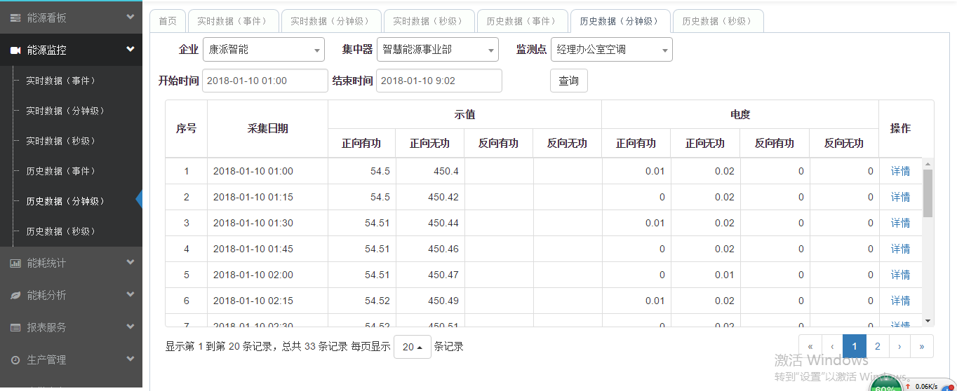 分钟级历史数据可以在历史数据(分钟级)中查到,选择集中器,选择监测点,选择时间段,点击查询就会调出如下图所示当前用能设备分钟级历史数据记录。通过查看不同时间的分钟级历史数据,可以了解设备用能情况,对月、季、年能耗分析起着重要作用。