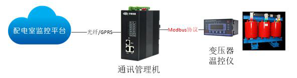 通过变压器温控器采集变压器三相铁芯的温度,及启停变压器的风机,有油位传感的可以检测油位,对于调容调压配电变压器,可以实现调容调压的操作和检测;变压器温控器通过Modbus通讯协议将温度信号传至通讯管理机。