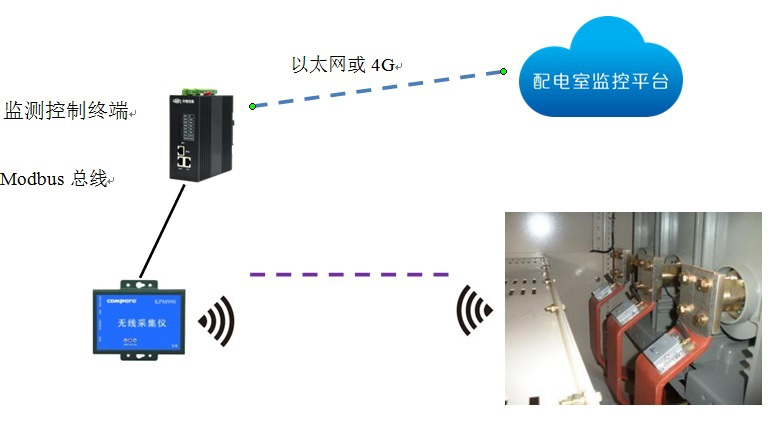 针对母排搭接处放置智能无线测温传感器,实时动态监测母排温度变化情况;在配电室或箱式配电室构建局部的无线基站,收集无线智能终端采集的数据,每十五分钟主动巡检一次,实现超温主动报警机制,避免长期高温运行,造成绝缘件老化。