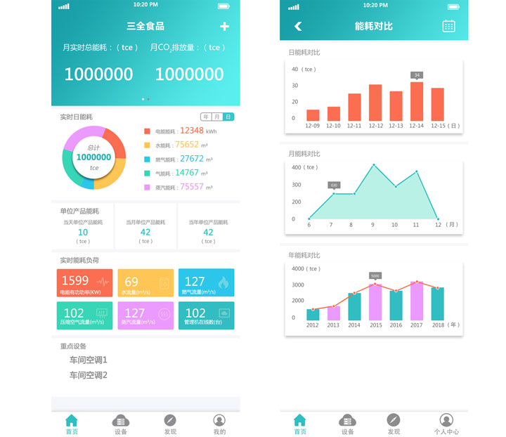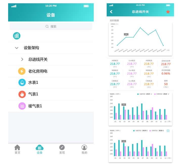 智慧能源管理系统App界面主要由:首页、设备、发现、我的四个栏目组成。