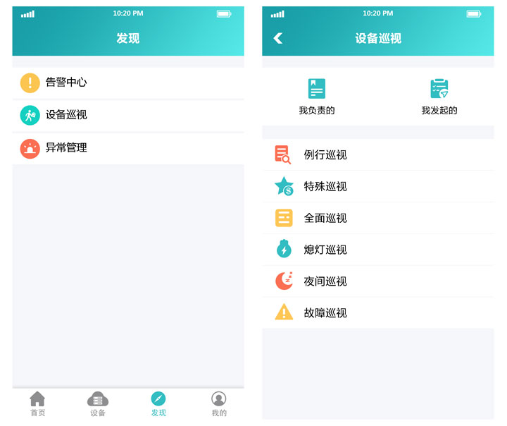 发现栏目侧重于设备的管理以及运维,主要涉及三部分分别是设备告警、设备巡视、异常处理;设备栏目及时推送设备告警信息,帮助运维人员处理异常情况;设备巡视则是对巡视内容进行记录与统计;异常处理则是帮助发现、记录、解决运维过程中的不合理情况;