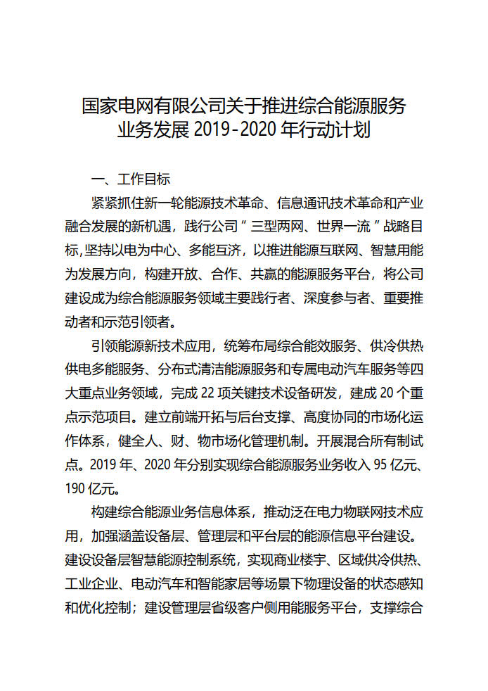 近日,国家电网有限公司(下称“国网公司”)正式印发《推进综合能源服务业务发展2019-2020年行动计划》。