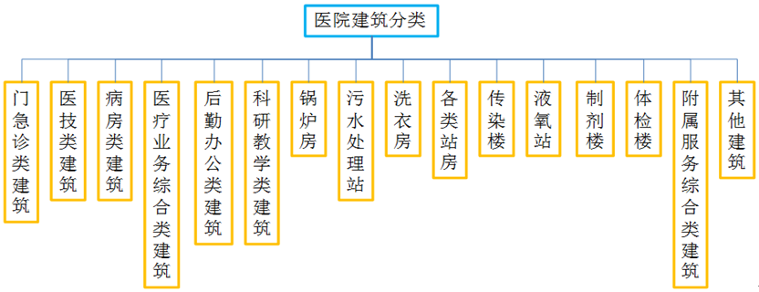 医院建筑根据医疗用途可分为门诊类建筑、医技类建筑、病房类建筑、医疗业务综合类建筑、后勤办公类建筑、科研教学类建筑、锅炉房、污水处理站、洗衣房、各类站房、传染楼、液氧站、制剂楼、体检楼附属服务综合类建筑等,如图所示。