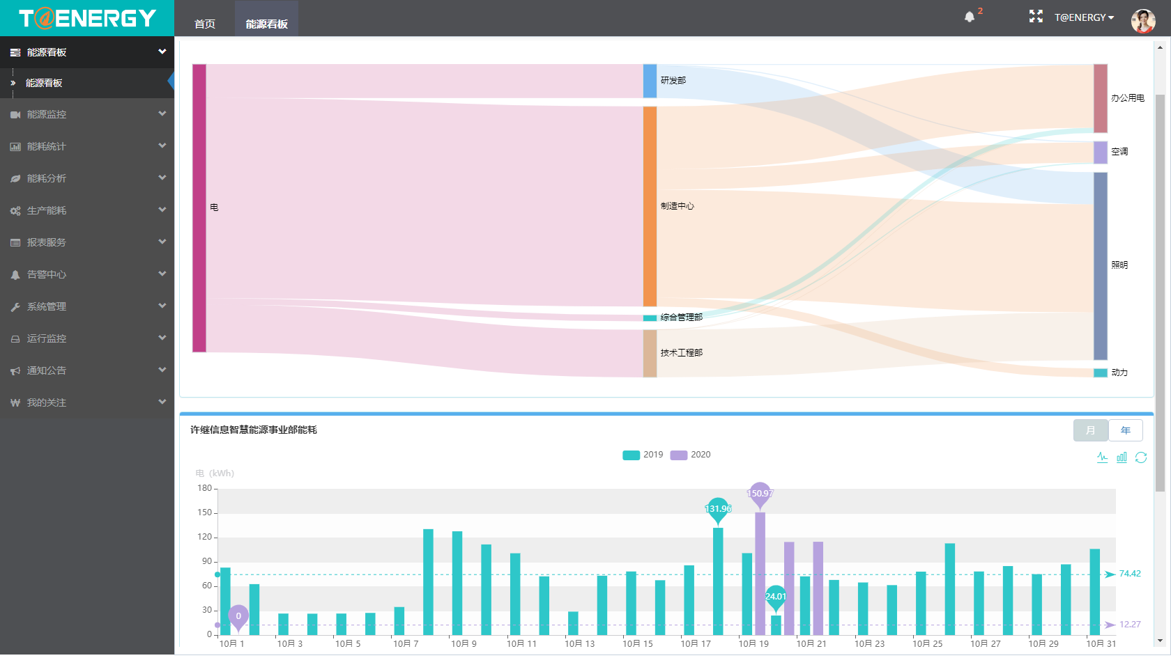 系统提供翔实可靠的能源数据,通过比对建筑区域、用能设备的能源投入产出比,挖掘各用能子系统的效能指标,持续不断地为管理人员提供合理的运行调节建议。