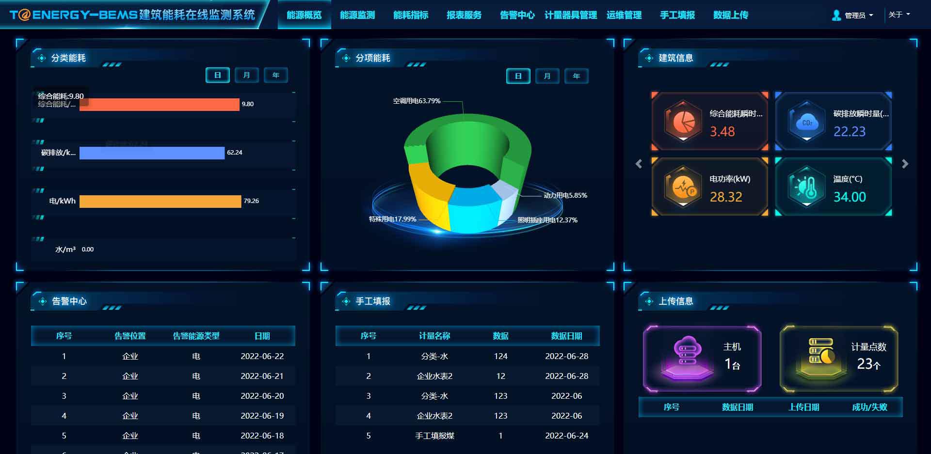 平台通过各类智能计量仪表在线监测建筑内电、冷、水、热等各项能耗数据,将各项数据以表格、曲线和图形等形式在各级终端展示,实现对各个用能环节的实时监测以及能耗数据的分类、分项、分区统计,保证数据源头的可靠性,为建筑用能的精细化管理提供依据。