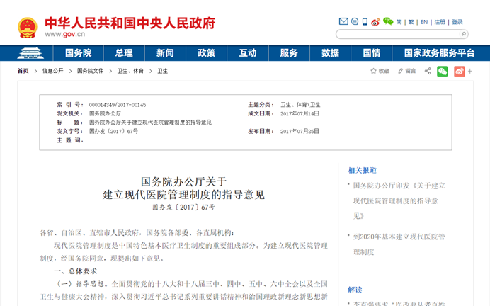1、2017年7月14日《建立现代医院管理制度的指导意见》