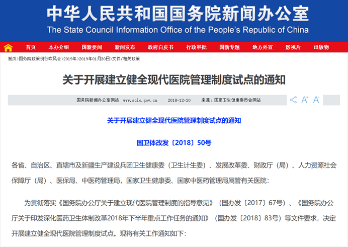 2、2018年12月5日《关于开展建立健全现代医院管理制度试点的通知》