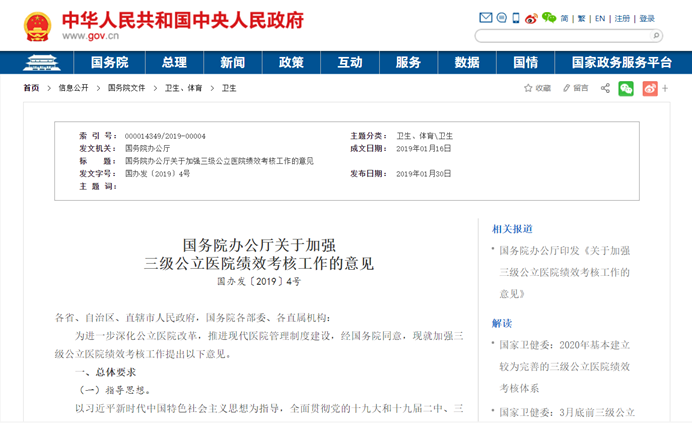 3、2019年1月29日《关于加强三级公立医院绩效考核工作的意见》