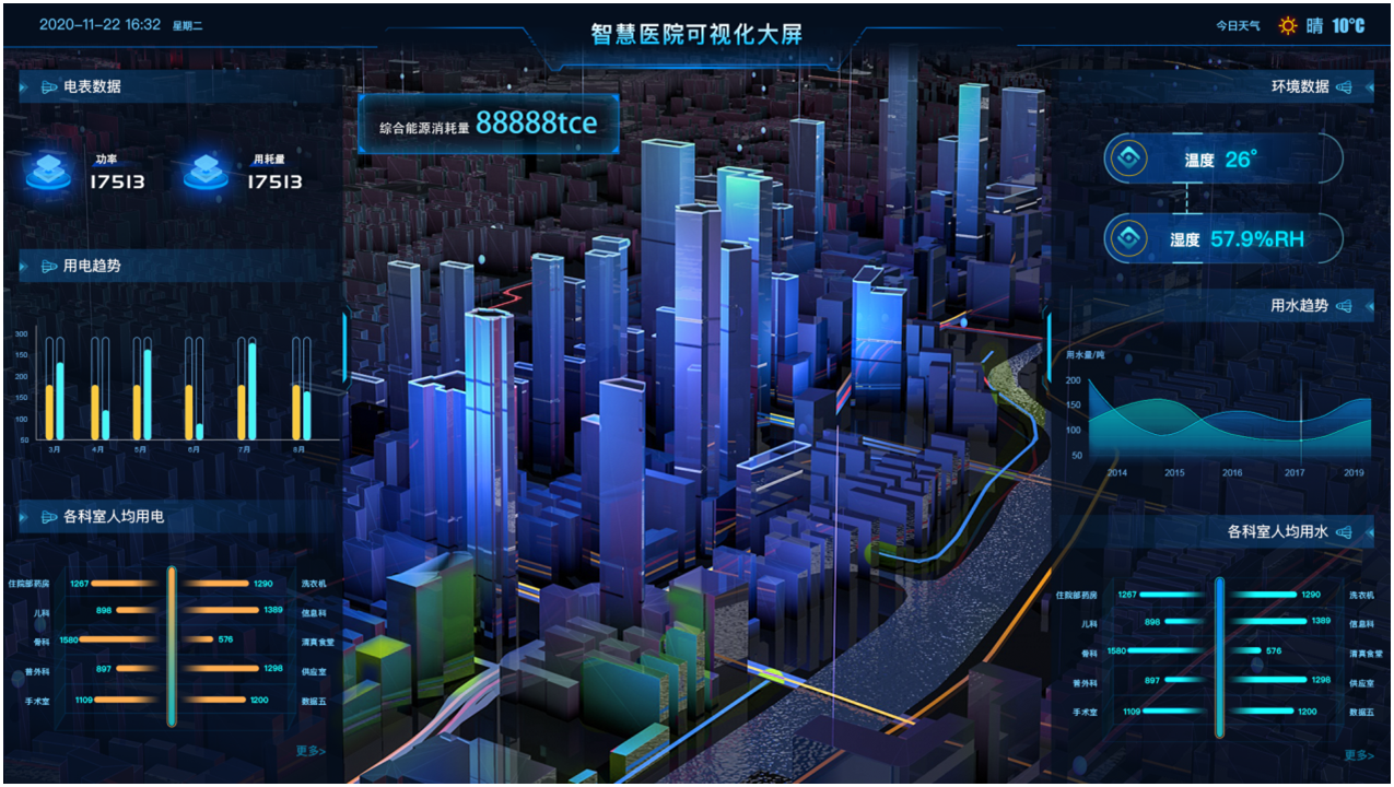 医院能源使用较为粗放,对建筑、功能区域、重点能耗设备等缺乏多维度统计方法进行计量与考核、能源浪费严重。