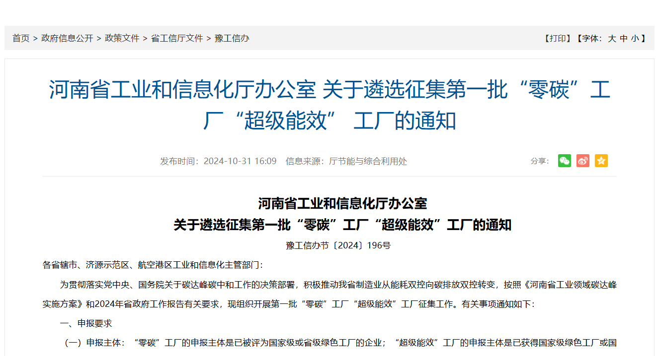 关于征集推荐河南省第一批“零碳”工厂 “超级能效”工厂的通知