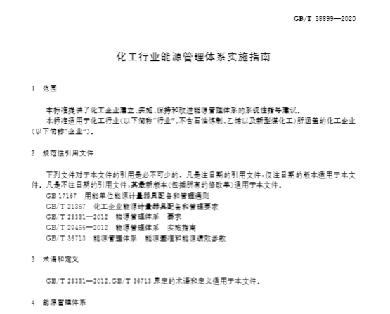 化工行业是一个高耗能行业,也是我国能源消耗的重点行业,其能耗总量占全国个工业总能耗的32%左右,化工行业覆盖的企业类型颇广,工艺流程迥异,且生产副产品种类繁多,普遍存在管理体系边界不清晰、能源绩效识别不全面等问题,本标准旨在引导化工企业合理建立能源管理体系,提高其能源管理绩效,包括提高能源效率,降低能源消耗。