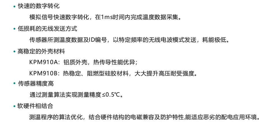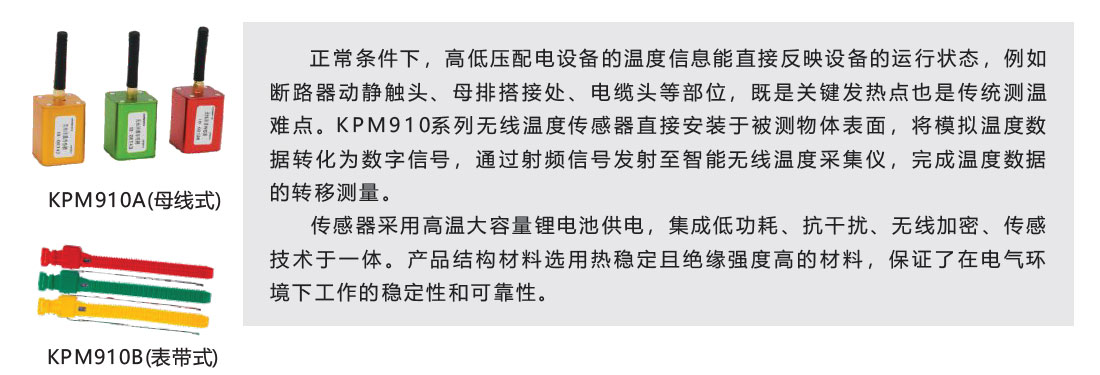 正常条件下,高低压配电设备的温度信息能直接反映设备的运行状态,例如断路器动静触头、母排搭结处、电缆头等部位,既是关键发热点也是传统测温难点。KPM910系列无线温度传感器直接安装于被测物体表面,将模拟温度数据转化为数字信号,通过射频信号发射至智能无线温度采集仪,完成温度数据的转移测量。