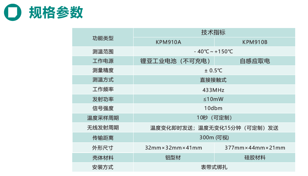 KPM910系列无线温度传感器直接安装于被测物体表面,将模拟温度数据转化为数字信号,通过射频信号发射至智能无线温度采集仪,完成温度数据的转移测量。