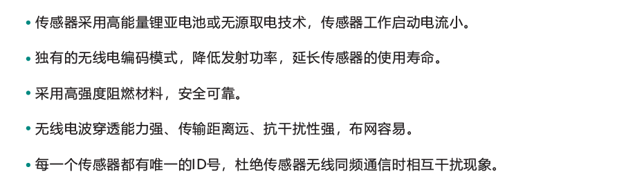 传感器使用高温大容量锂电池供电,集成低功耗、抗干扰、无线加密、传感技术于一体。产品结构材料选用热稳定且绝缘强度高的材料,保证了在电气环境下工作的稳定性和可靠性。