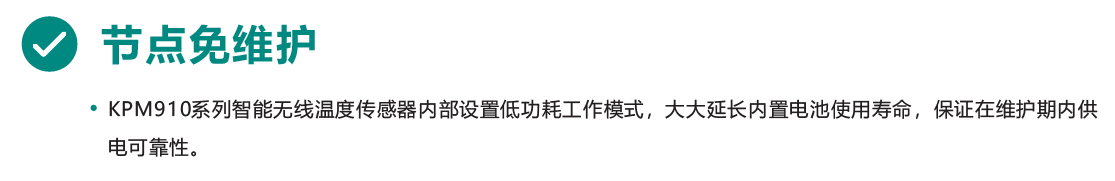 KPM910系列无线温度传感器可应用于高低压配电柜、变压器、电缆隧道、电缆桥架、旋转设备、医院、机房、冷链、冷藏等场合。