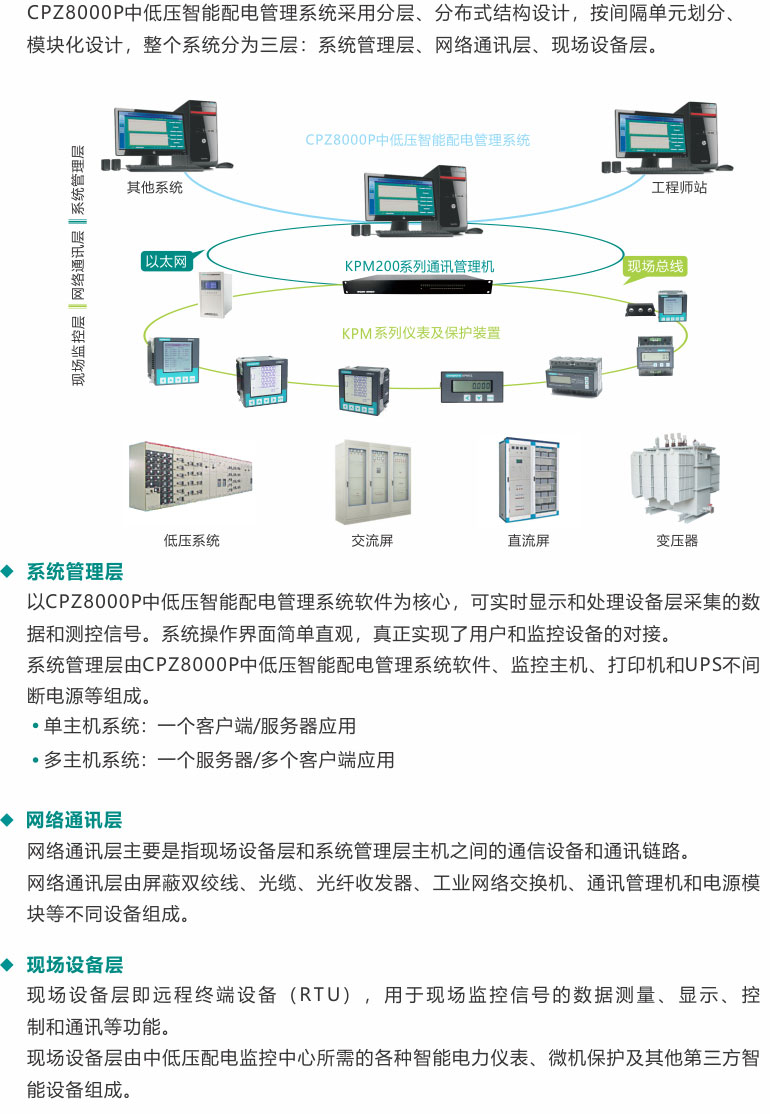 CPZ8000P中低压智能配电管理系统采用分层、分布式结构设计,按间隔单元划分、模块化设计,整个系统分为三层:系统管理层、网络通讯层、现场设备层。