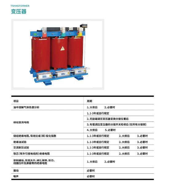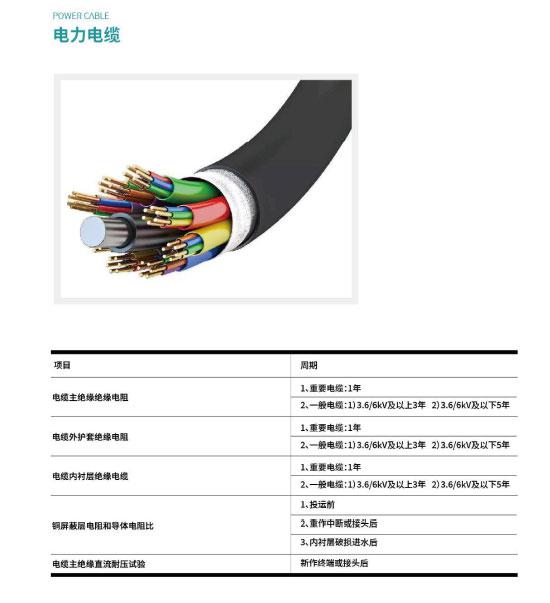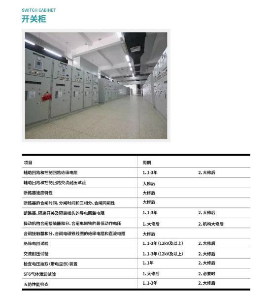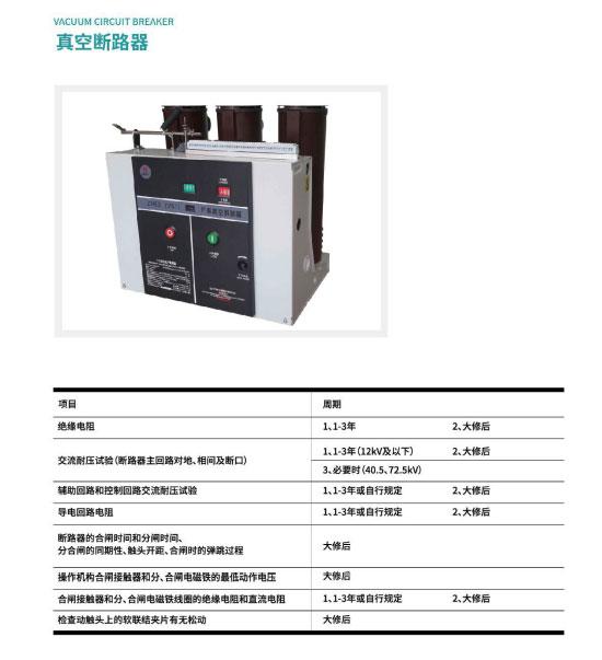 根据DL/T 596-2005《电力设备预防性试验规程》要求,电气设备需按照规范要求定期做预防性试验及完成相应试验项目,其中变压器、电力电缆、真空断路器和开关柜等主要的配电室内电气设备的常规试验项及周期如下所示。