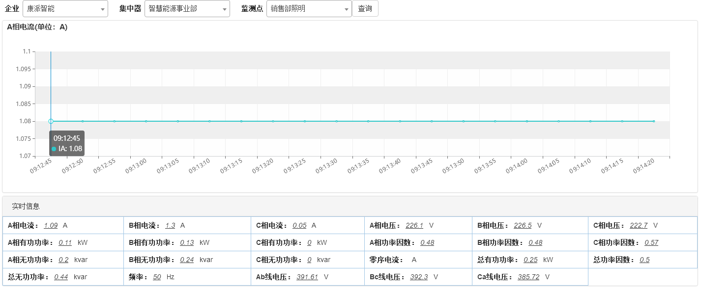 秒级实时数据主要展示用电设备电压、电流、有功功率、无功功率和功率因数等数据,每5钟刷新一次。选择集中器,选择监测点,点击查询就会调出当前用能设备分钟级实时数据。点击数据变量,就会生成与之相对应的实时曲线,通过曲线查看数据情况,进而了解设备运行情况。