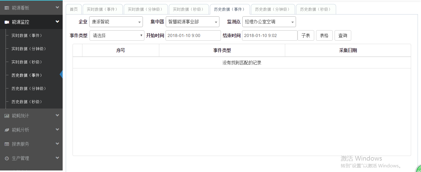 现场设备有历史遥信变位、历史越限告警和历史故障报警时,会在历史数据(事件)中查到,选择集中器,选择监测点,选择事件类型,时间段,点击查询就会调出如下图所示当前用能设备历史事件记录。