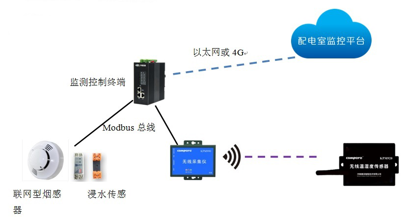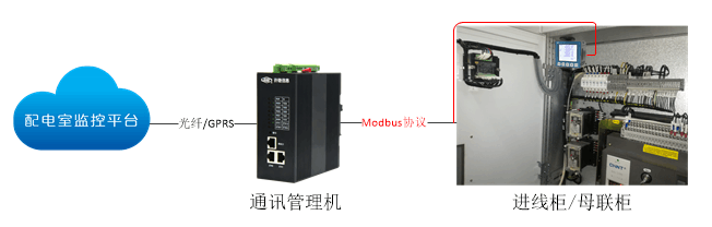 通过变压器温控器采集变压器三相铁芯的温度,及启停变压器的风机,有油位传感的可以检测油位,对于调容调压配电变压器,可以实现调容调压的操作和检测;变压器温控器通过Modbus通讯协议将温度信号传至通讯管理机。