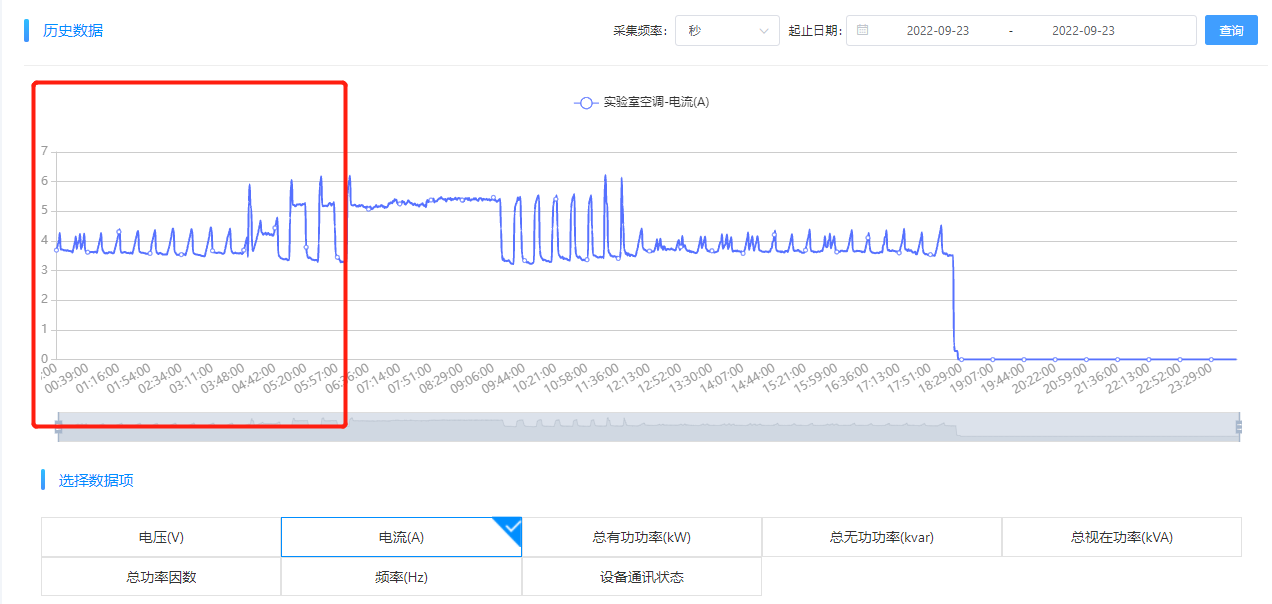 异常用能确认。根据“能源监控—历史数据分析”来进一步确认异常点的异常数据,9月23日的用能异常确实是“嵌入式组-实验室-空调”设备未关机造成的。拉取9月22日至9月23日数据,发现,该嵌入式研发实验室的空调在9月22日上午10点开机后,至次日9月23日下午17点35分左右关机,9月22日未关机。