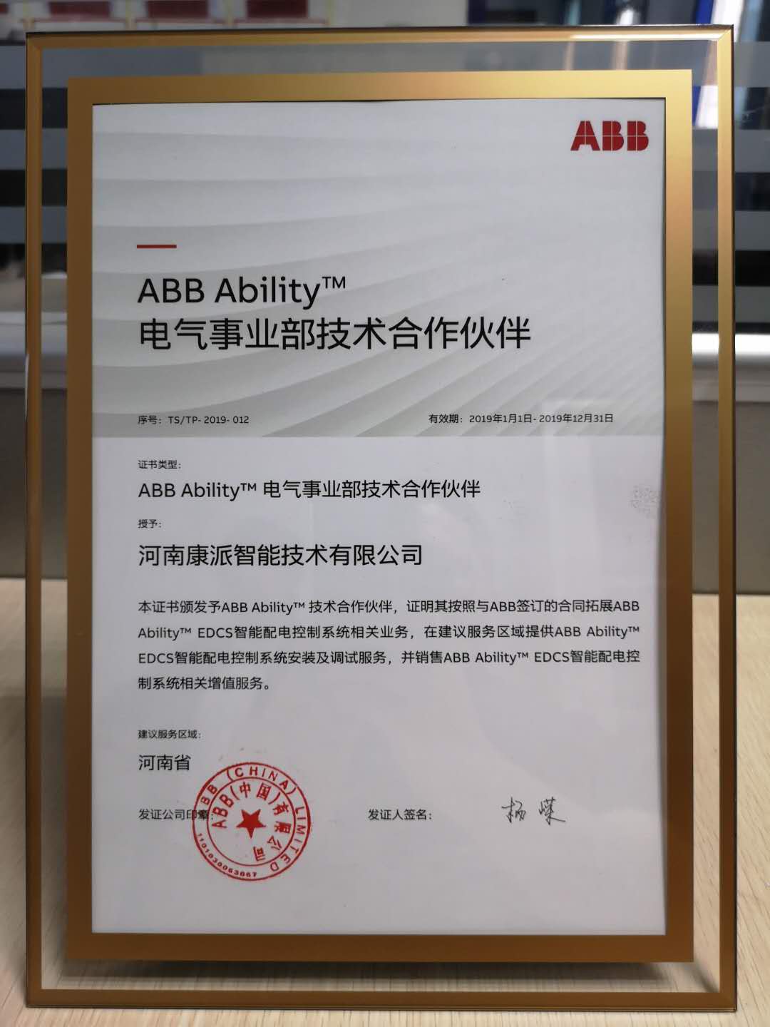 本证书颁发予ABB AbilityTM技术合作伙伴,证明其按照与ABB签订的合同拓展ABB AbilityTM EDCS智能配电控制系统相关业务,在建议服务区域提供ABB AbilityTM EDCS 智能配电控制系统安装及调试服务,并销售ABB AbilityTM EDCS 智能配电控制系统相关增值服务。