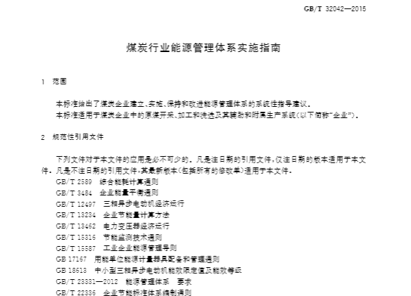 《煤炭行业能源管理体系实施指南》结合煤炭企业特点制定,通过分析煤炭企业能源管理,能源使用及能源消耗现状,结合我国煤炭行业能源管理经验和成果,指导煤炭企业建立、实施、保持和持续改进能源管理体系,实现能源目标,达到规范企业能源管理行为、降低能源消耗、提高能源利用率、促进企业可持续发展的目的。