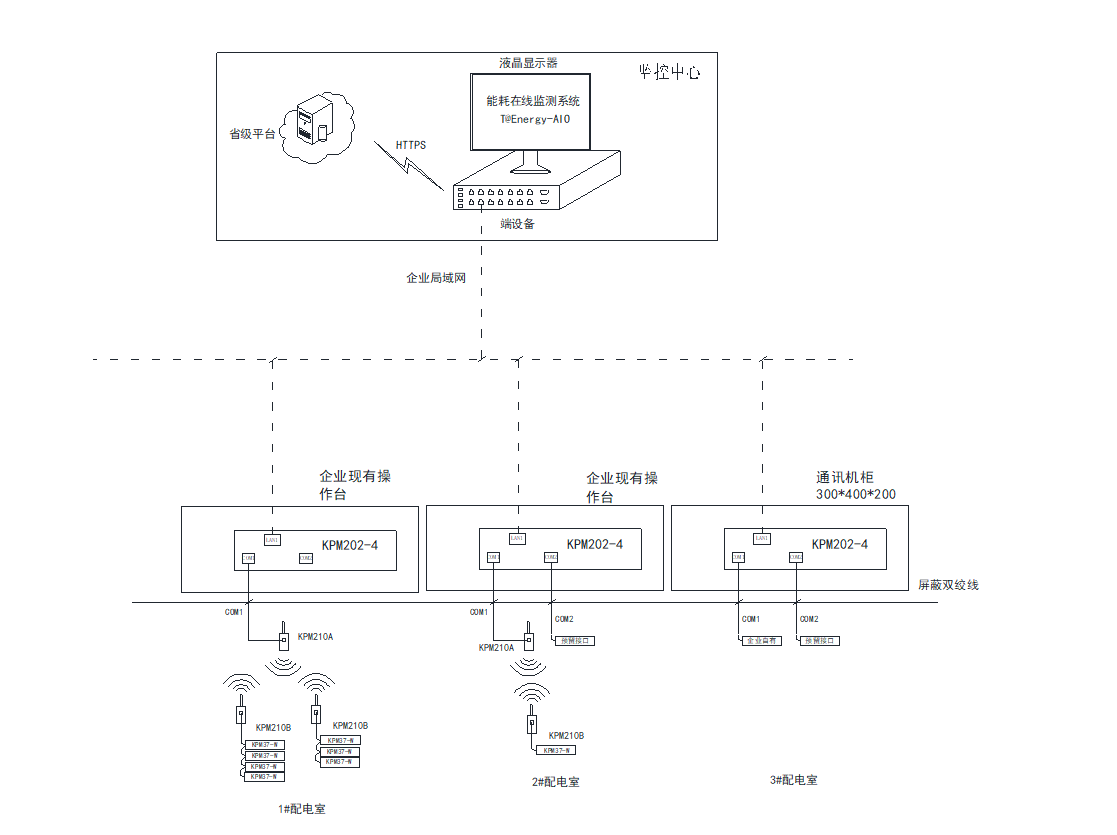 网络通信设计:1#配电室位于东厂区,配电室内有东、西两排柜子,其中污水处理监测点和低压总进线监测点位于东边配电柜,共计4个监测点共用一台无线LORA发送端。数据通过企业局域网将数据传输至